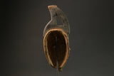 This particular wooden face mask from the Guro tribe of Africa is known as the "gägon" mask and originates from Liberia. The mask features an exaggerated zoomorphic snout, while the eyes of the mask are pierced through and surrounded by a rubbed, darkened surface.