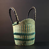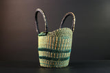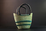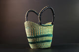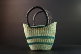 African Bolga basket green natural handwoven market tote bag leather handle Ghana decor woven storage shopping basket art G5626