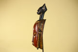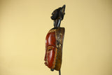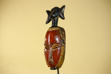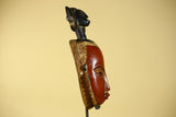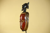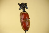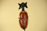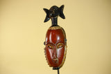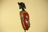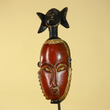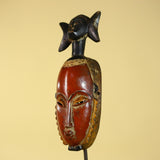 This handcrafted African mask represents classic Baule style African art, carved from solid wood and finished with natural pigments. The elongated facial form, warm red tones, and symbolic figure above the crown make this African mask a striking example of traditional African wall art.