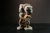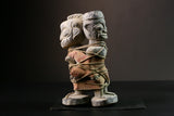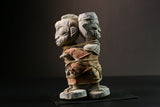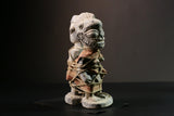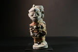 This remarkable antique figure, hailing from the region once known as Zaire, is a captivating example of Kongo artistry. Crafted by the Bakongo people, it depicts a striking human form with an oversized head, an open mouth, and expressive glazed eyes. One arm is dramatically raised, inviting a closer examination of its potent symbolism. This figure is exquisitely adorned with an array of iron nails and other elements, each meticulously embedded in a pattern that enhances the figure’s powerful presence. The unique perforations, blending organic and ferrous attributes, are not mere decoration but serve an essential spiritual function. Of particular note are the figure's chest protrusions, where the mystical energy or bilongo is believed to reside. These elements are central to the sculpture’s role as a conduit of spiritual power, revered for their ability to invoke protection, healing, or justice. Originating from the heart of the Democratic Republic of the Congo, Angola, and the Congo, this figure embodies the intricate spiritual practices and artistic excellence of the Kongo people. Such a piece offers a profound connection to the mystical traditions and cultural heritage of African masks and ritualistic figures. Ideal for collectors and admirers of African tribal art, this hand-carved statue stands as a testament to the rich history and spiritual depth of Kongo craftsmanship. Whether displayed in a gallery or a home, it captivates with its historical authenticity and ceremonial significance, reflecting the enduring legacy of African tribal artistry.