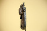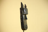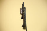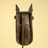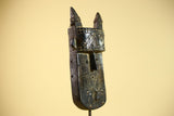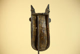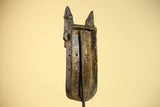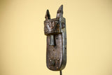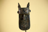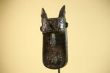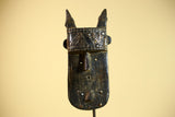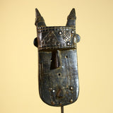 Authentic African tribal mask from the Toma people of Guinea, hand-carved from wood and decorated with hammered metal plates and fiber cord. The tribal mask features twin horn shapes above the brow and pierced sides for attachment. With deep aged patina and ritual wear, this 27.5 cm (10.8 in) piece captures traditional Toma symbolism and artistry. Stand not included.