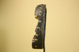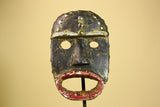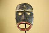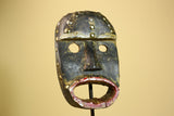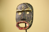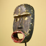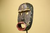 This African tribal mask is a vintage carved wood mask decorated with metal studs. The mask measures 22 cm x 14.4 cm x 5 cm (8.6" x 5.6" x 1.9"). The mask shows age, surface wear, and a natural patina from use. The bold open mouth and raised brow give the mask strong ritual character linked to West African traditions. Ideal as a collectible mask or striking wall display for tribal art lovers. Stand not included.